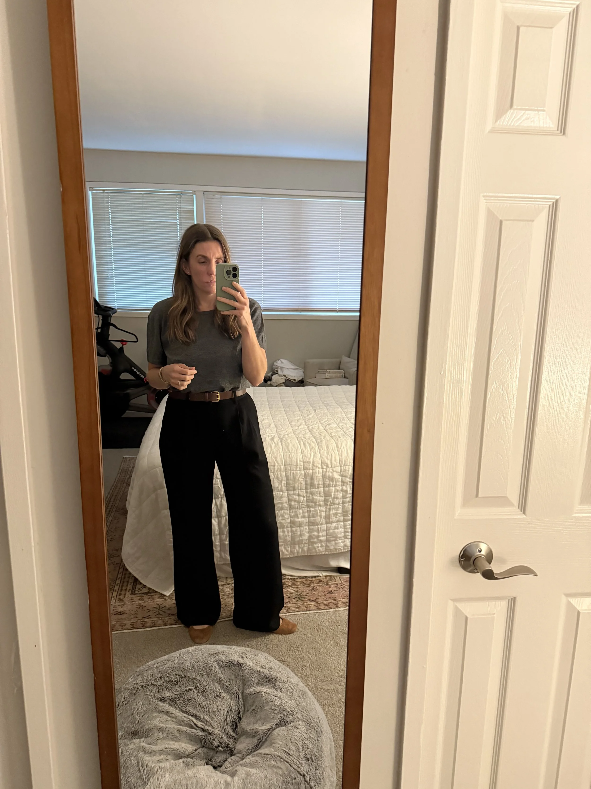 then we had rain and gloom. this outfit is easily repeatable, simple, but chic. i loved adding the differentiation of using a dark brown belt, as opposed to adding more black. i love this sweater tee with a wide leg pant (favorite!!), and this belt is phenomenal.